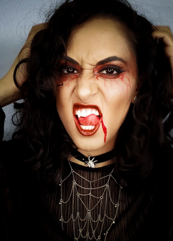 Use a matte red lipstick to create the blood line on the side of my mouth and put Mora Cosmetic's Satin Sheen Multistick in the shade Jessie's Girl on my lips for a darker glam vamp look.